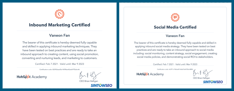 恭喜SINTOWSEO技術(shù)總監(jiān)順利通過(guò)社交媒體認(rèn)證、入境營(yíng)銷(xiāo)認(rèn)證。